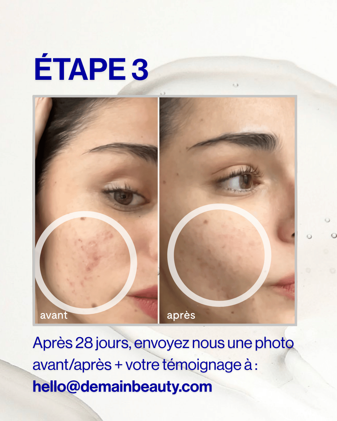 Une fois un changement observé, envoyez votre photo avant/après accompagnée de votre ressenti à l'adresse hello@demainbeauty.com !
